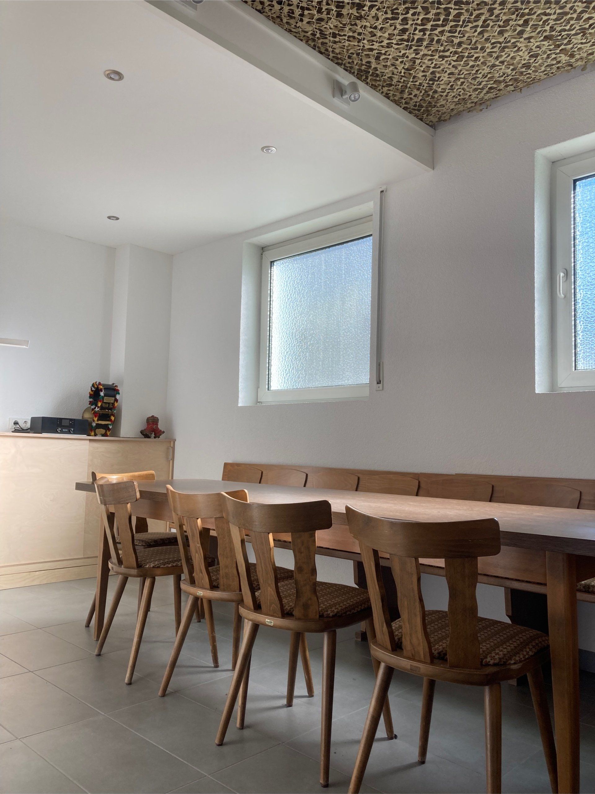 Als zusätzlicher Stauraum wurde eine Zwischendecke eingebaut und alte Fliesen an Wand und Boden entfernt. Alles ist nun neu gefliest, verputzt, die Beleuchtung erneuert und ergänzt und eine neue Küchenzeile eingebaut. Das Material wurde von der Gemeinde zur Verfügung gestellt und die ca. 120 Arbeitsstunden in Eigenleistung erbracht.